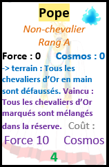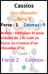 - Ca a vraiment été le coeur du développement. Comme dit plus haut, les mécaniques ont été immédiatement définies et ont très peu bougé au fil des versions. Mais pour les équilibrages des cartes, ça a été une autre paire de manches. Chaque personnage pouvait avoir au maximum un coût en Force, un coût en Cosmos, une valeur de Force, de Soin, de Cosmos, de Points de Victoire et jusqu’à 2 effets. On avait évidemment un fichier Excel pour tout référencer et éviter de se perdre, mais les cartes n’ont pas été équilibrées via des formules compliquées, pour 2 raisons. La première est que ces valeurs devaient refléter la réalité de la série, et la seconde est qu’il y a énormément d’effets différents jouant sur des notions différentes. Comment évaluer l’effet de Jamian du Corbeau qui change la position des cartes sur le terrain ? Quelle équation pourrait permettre d’en définir son coût en Force ou ses Points de Victoire ? On est très loin d’un Dominion ou Star Realms où toutes les cartes tournent autour de 3 valeurs, et donc mathématiquement valorisables. Nous sommes donc partis d’abord de la série pour déterminer les valeurs des personnages. Evidemment qu’un Chevalier d’Or doit coûter plus cher et être plus puissant qu’un Chevalier d’Argent. Mais l’univers de Saint Seiya n’est pas si simple, et il n’est pas évident par exemple de représenter Aphrodite comme un personne doté d’une Force physique exceptionnelle, ni même de lui donner une grosse valeur en Cosmos alors qu’il ne démontre pas grand-chose. On a donc respecté au mieux la série sur les valeurs chiffrées, puis on ajoutait des effets permettant d’équilibrer la carte tout en restant thématique. Pour rester sur l’exemple d’Aphrodite, étant un Chevalier d’Or on se devait de lui laisser un coût élevé et des Points de Victoire élevés, mais on ne pouvait définitivement pas en faire une carte badass. On lui a donc trouvé un effet qui rendait tout de même son acquisition intéressante, non pas parce qu’il va rendre votre deck plus fort, mais parce que son effet est un poison comme il l’est dans la série sans même avoir à démontrer une quelconque force physique ou cosmique.